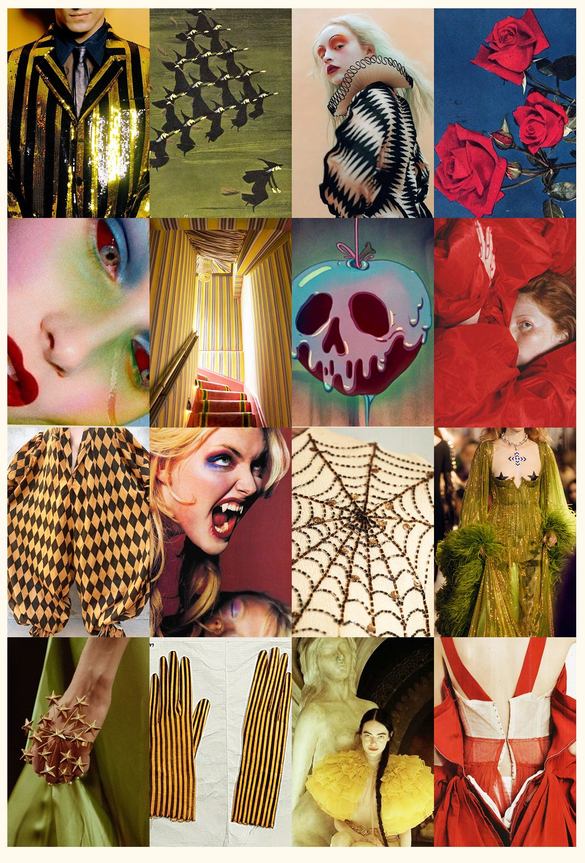 While I, like most Halloween lovers, find the color combination of orange and black to be both classy and classic, we must begin to think outside the box when it comes to dreaming up a festive mood board! I love the idea of skewing more primary colors, wacky patterns, vintage clown circus whimsy (of the not terrifying variety.)