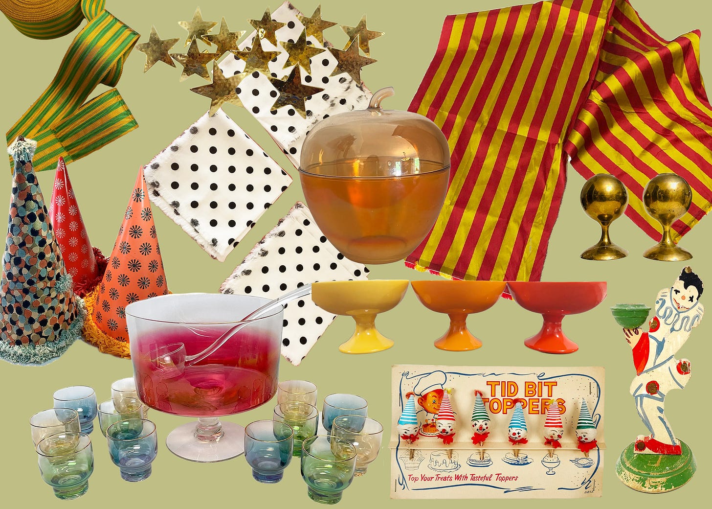 vintage cotton spun clown party toothpicks (set of 6, $35, buy on eBay) - I love old cotton spun decor…definitely wouldn’t put these near food given the age and suspect glue, but it does make delightful party decor