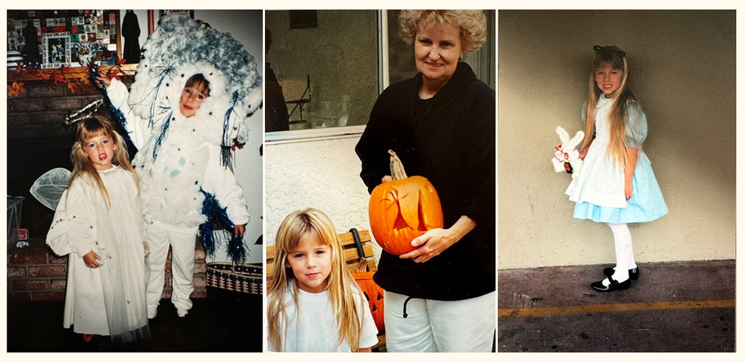 My love of October as a month and Halloween as a holiday (as well as most of the things that make me, me) is really all thanks to my grandmother and the goddess of Halloween, Shirley Ann. She was a fierce crafter, seamstress, maker and doer and the more time my sister and I spent with her, the more we became her tiny DIY shadows. She had a particular talent for looking at something in an expensive shop, examining it carefully, and then going home and recreating it no matter if it meant sewing, sculpting, painting or whittling.