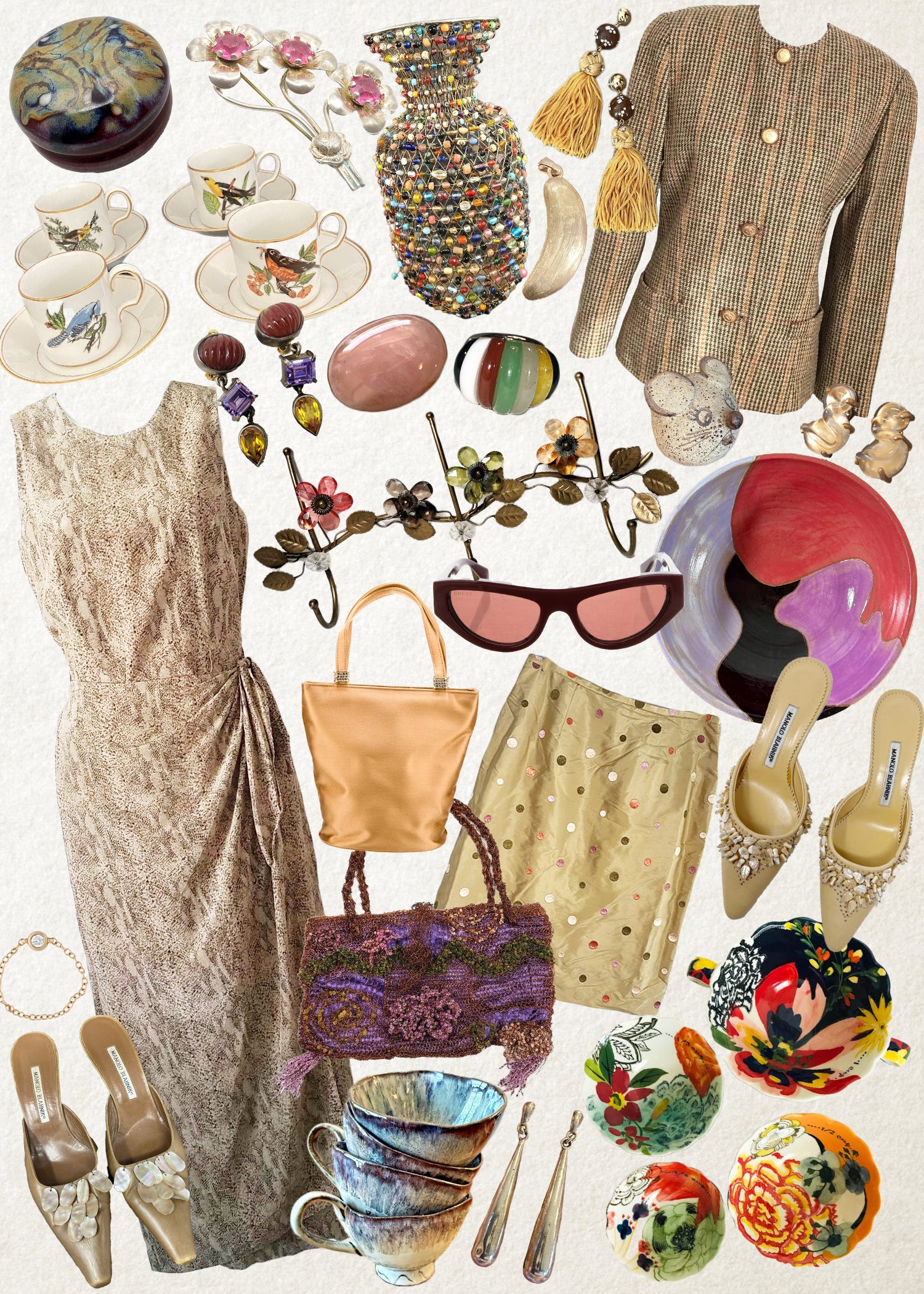 you’re going to see the brand spenser jeremy a lot in here because it’s a delightful rabbit hole i went down the other day — lots of affordable silk that’s better than any fast fashion you’re spending your $$$ on!!fitz and floyd for neiman marcus bird teacups (set of four, $54, purchase on eBay)