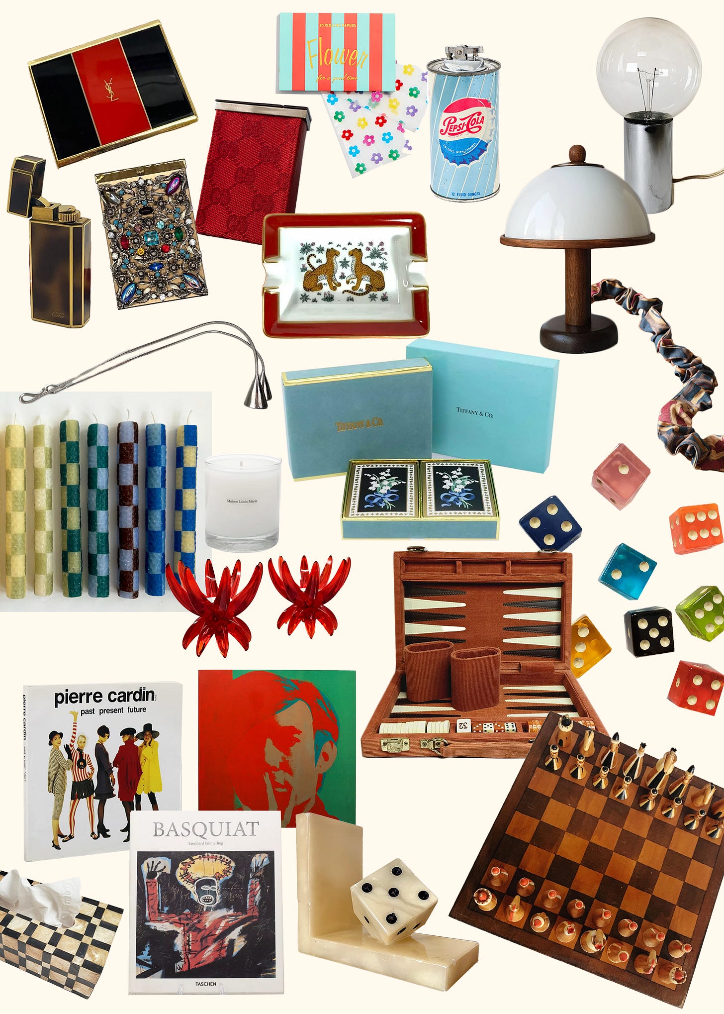 (If anyone is still on the hunt, I also suggest pairing a matchbook with an antique brass or enamel matchbook holder; cool antique books with spines for display; vintage hotel or restaurant ashtrays paired with incense (or with soap - they make great soap dishes!); and vintage wool sweaters.)
